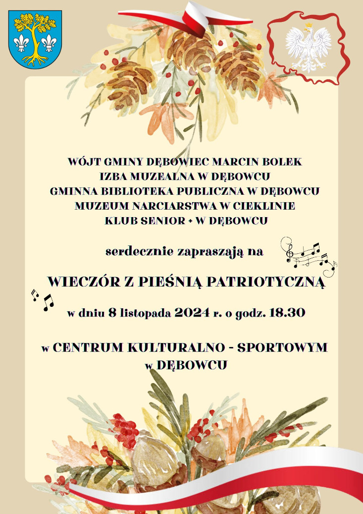 Serdecznie zapraszamy do wzięcia udziału w WIECZORZE PATRIOTYCZNYM z okazji 106. rocznicy odzyskania niepodległości, który odbędzie się w budynku Centrum Kulturalno-Sportowego w Dębowcu.